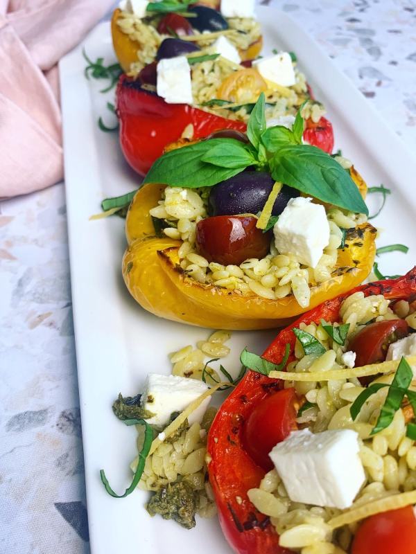 Une recette qui sent bon l'été avec ces des poivrons, de la fêta, de la tomate, des olives et du pesto.