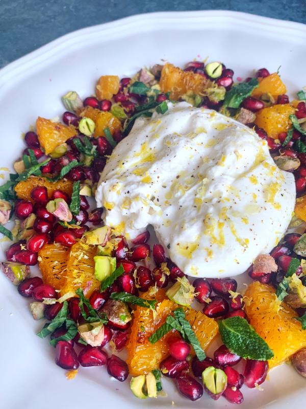 Une recette de burrata sucrée qui fait plaisir aux yeux et c’est plein de vitamines avec de l'orange, de la grenade, des pistaches.