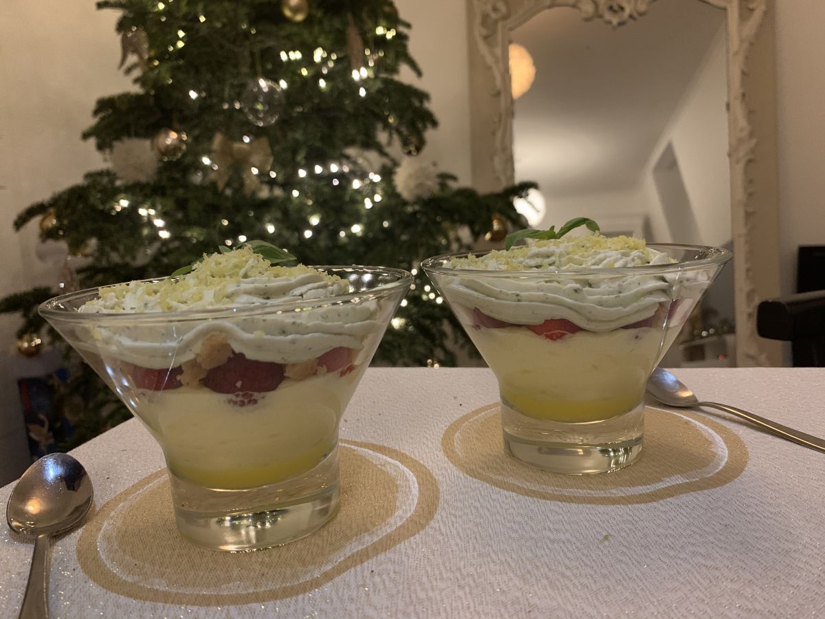 Pour la décoration : Dans votre verrine où vous avez préalablement versé la mousse au citron, disposez des framboises et fraises. Émiettez des petits biscuits secs pour apporter du croquant. Pour finir, à l’aide d’une poche à douille, pochez votre chantilly. Zestez un peu de citron et ajoutez une petite feuille de basilic.